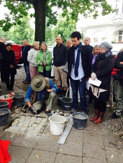 Lors de cette pose de Stolpersteine, les bruits des coups la bêche et du marteau de l'artiste ont ensuite été couverts par les récits des vies de ces personnes. L'histoire d'une familles, d'une étudiante en mathématiques, ou encore d'une mère seule avec son fils, tous déportés ou forcés des s'exiler pour pouvoir échapper aux griffes de la Gestapo.