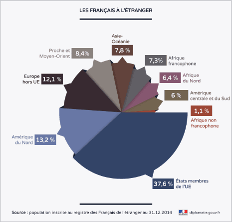 Le gouvernement a dévoilé dans un rapport la répartition géographique des Français de l'étranger, et son évolution. La hausse du nombre de Français à l'étranger (+37.600 inscrits), est légèrement supérieure cette année à celle observée en 2013 (le nombre d'inscrits avait alors progressé de près de 2%), mais est légèrement inférieure à la tendance moyenne d'accroissement de la communauté française à l'étranger au cours des dix dernières années, à savoir 3%.
