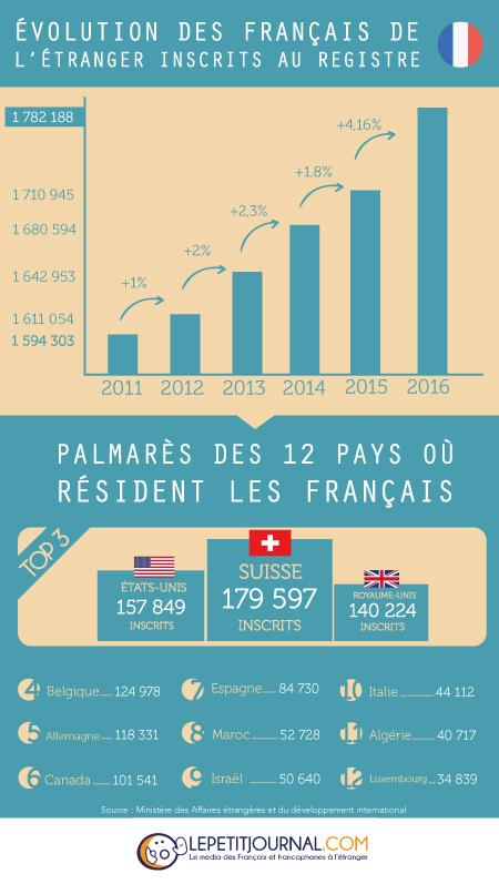 Année après année, le nombre des Français établis hors de France progresse. La communauté française inscrite au registre consulaire s'établit à 1.782.188 personnes au 31 décembre 2016. Les 5 premiers pays d'accueil - Suisse, États-Unis, Royaume-Uni, Belgique et Allemagne ? concentrent près de 40 % des Français de l'étranger.