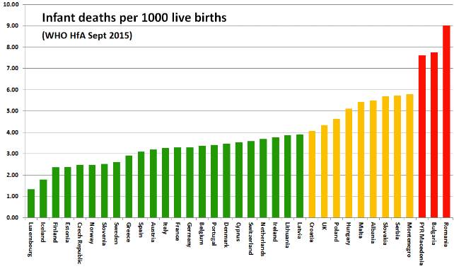 Les huit pays les moins bien classés (Grèce, Lituanie, Serbie, Bulgarie, Roumanie, Albanie, Pologne et Montenegro) ont gagné en moyenne 32 points entre 2014 et 2015. La Lettonie et la Lituanie ont fait baisser la mortalité infantile alors même qu'ils étaient sous le coup de mesures d'austérité importantes. La Roumanie et la Bulgarie restent les pays au taux de mortalité infantile le plus élevé, (entre 8 et 9 décès pour 1000 naissances). Une amélioration notable même si le rapport insiste sur la difficulté d'évaluer réellement les systèmes de santé dans les pays des Balkans, compte tenu des nombreux paiements qui sont effectués « sous la table ».