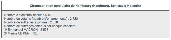 Pour le second tour de l'élection présidentielle, Emmanuel Macron remporte le scrutin avec une majorité de 66,1% des suffrages exprimés contre 33,9% pour Marine Le Pen. À Hambourg, Emmanuel Macron remporte 2 538 suffrages contre 120 pour Marine Le Pen.