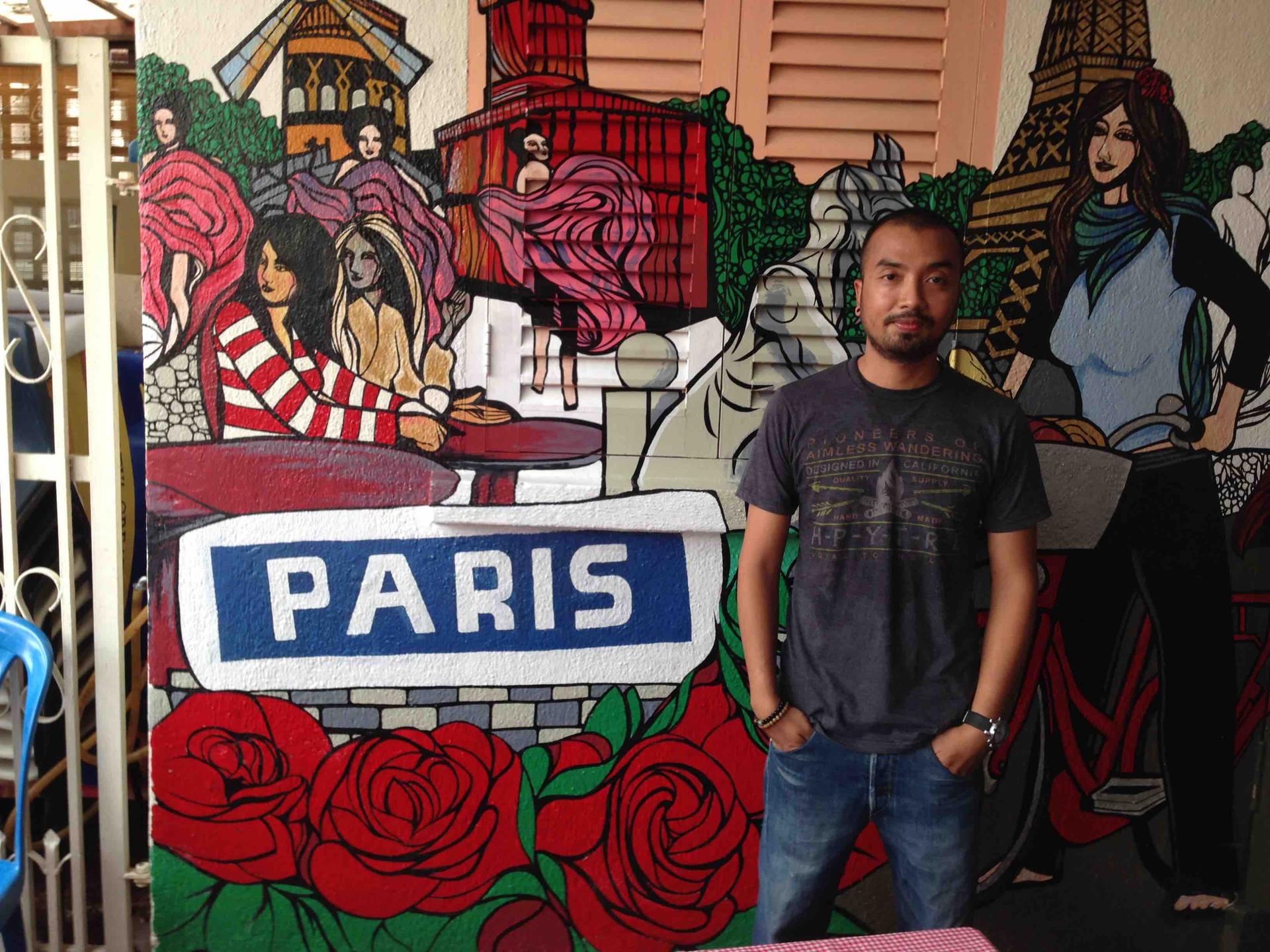 Peindre cette façade a été un nouveau challenge que l'artiste a relevé avec plaisir, d'autant plus qu'il revenait ainsi, mettre une marque sur la terre de son enfance. Lorsqu'on lui a demandé quand il avait commencé à peindre, d'un air coquin il a répondu "quand j'avais 3 ans ! Je dessinais partout dans la maison, en particulier dans ma chambre, sous les tapis, pour n'être découvert que le jour où mon frère a tout raconté à ma mère''. Architecte de formation, il a ensuite étudié les multi-médias et l'art graphique pour se consacrer plus tard aussi à la peinture et l'animation. Il expérimente et applique sa créativité dans des domaines variés, allant de l'impression digitale, aux arts visuels pour des événements et des productions théâtrales, de la publicité pour des sociétés, aux publications de livres, en passant par la photographie, la cinematographie, et la peinture plus traditionnelle. Il a notamment participé à la production Mud : Our Story Of Kuala Lumpur, présentée par la municipalité de Kuala Lumpur. Elan est un artiste pour le moins versatile.