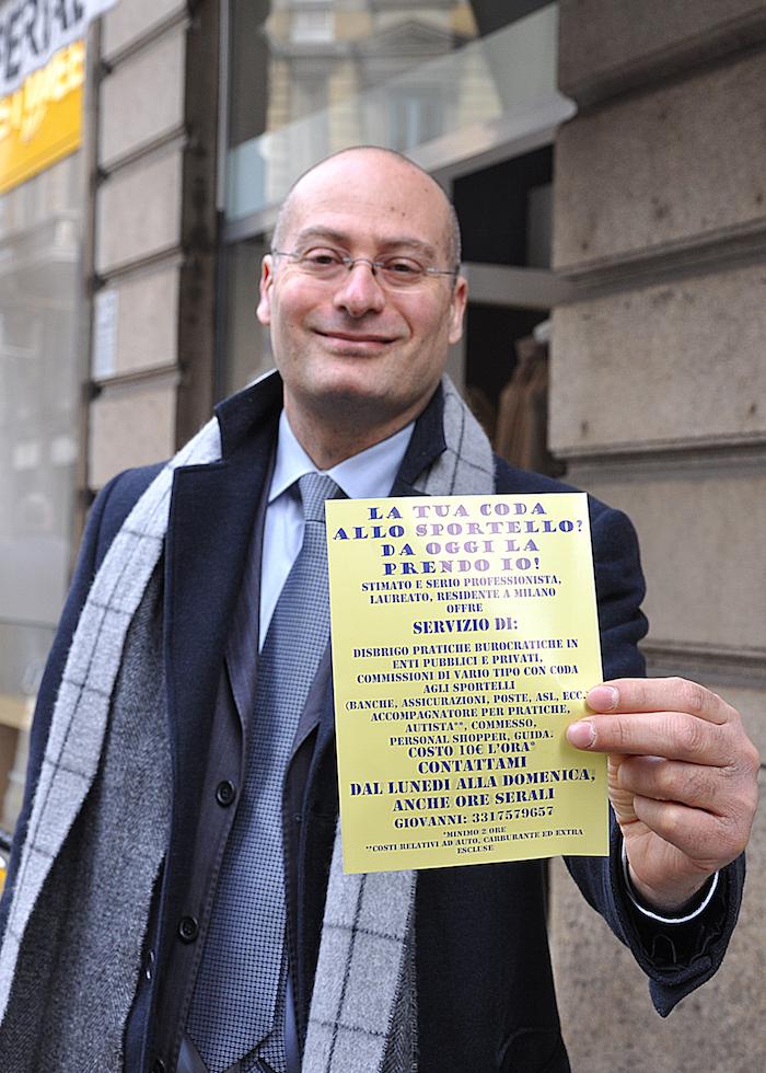 J'ai donc développé mon idée de faire la queue pour les autres, qui me plaisait énormément. Tout d'abord, j'ai créé un flyer pour faire de la publicité à ce service, avec la phrase : "Ta queue commence à l'entrée, à partir d'aujourd'hui je la fais pour toi". J'ai commencé à distribuer les flyers un peu partout dans Milan, et peu à peu je me suis fait connaitre. J'ai même inventé un terme pour définir cette activité : le "codista". Je fais la queue, et quand vient le tour du client, il prend ma place. Parfois, en plus d'effectuer la queue, il m'arrive de lui rendre un service à l'intérieur du lieu donné.