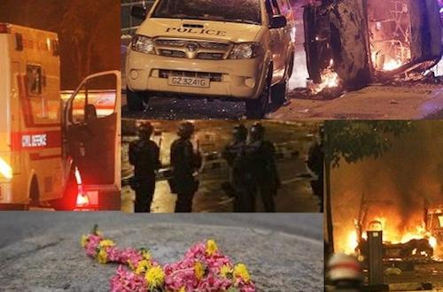 Selon certains observateurs, les secours ne sont intervenus que 30 minutes après l'accident. A leur arrivée, une foule déjà compacte de gens en colère ?ils seront 400 dans quelques minutes-. Quand leur compatriote est déclaré mort sur les lieux mêmes de l'accident, le ton monte. Sur les vidéos prises par les badauds avec leur téléphone portable et diffusées sur Youtube (l'une d'elles ayant comptabilisé ce matin 170.000 vues a été retirée en milieu de journée - ), on voit certains hommes lancer des poubelles sur le bus, taper sur ses vitres, jeter des bouteilles en verre sur les ambulanciers et les policiers anti-émeutes. Deux heures plus tard, le bilan semble incroyable : dix-huit blessés, dont dix policiers (sur les 300 déployés) et le chauffeur du car singapourien, cinq voitures de police endommagées dont deux littéralement retournées, une ambulance en feu et 27 ouvriers arrêtés. Ils risquent jusqu'à sept ans de prison et des coups de canne.