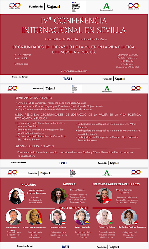 La IVª Conférence internationale qui célèbre la Journée Internationale de la Femme se tiendra le 6 mars à 18h30, au Théâtre de la Fondation Cajasol, situé Plaza de San Francisco nº 1, à Séville, un événement en collaboration avec la Junta de Andalucía et l'Ambassade de France en Espagne.cette année, la soirée aura pour thème : « Les opportunités du leadership des femmes dans la vie politique, économique et publique ».
