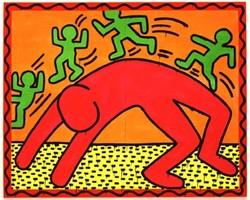 La ligne reine de Haring organise par prolifération libre une iconographie faite de chiens, d'ordinateurs, de télés, de bébés à quatre pattes et de personnages synthétiques toujours étrangement anonymes. Derrière l'apparente bonhomie de l'oeuvre, rodent quelques ombres, quelques monstres : la menace nucléaire, le racisme ou le virus du sida qui l'a d'ailleurs emporté à 31 ans.