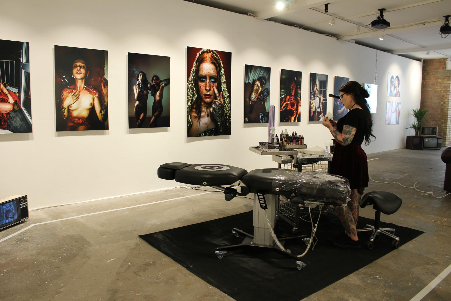 Par multimédia, l'entrepreneur entend aussi la collaboration entre des artistes venus d'univers différents. Il cherche à créer des passerelles, entre la photographie et le tatouage par exemple. Le jour de notre visite, une artiste tatoueuse avait installé un studio de tatouage temporaire dans la galerie. Elle réalisait sur une cliente une réinterprétation sous forme de tatouage d'une des photos exposées au mur. ?Je recherche avant tout des artistes qui ont une certaine originalité dans leur manière de faire des tatouages, notamment ceux qui s'inspirent de photos et qui ensuite les réinterprètent. Je trouve que les tatouages ne sont pas toujours originaux aujourd'hui?, précise Lakin.