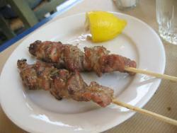 Le service est rapide, le menu est même imprimé en français, que l'on reconnait malgré une quantité impressionnante de fautes de frappe. Qu'importe : le patron a fait l'effort ! Pour les petites faims, nous vous conseillons de vous rabattre sur les « kalamakia » : ces petites brochettes de viande de porc grillées, à l'origan et au citron, que l'on déguste du bout de son bâton de bois, un peu comme si on tenait une sucette. Les « Xorta » (herbes sauvages cuites) sont délicieuses, et selon la saison vous pouvez trouver des « Vlitas », une sous variété, toute aussi succulente.