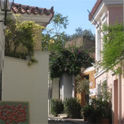 Juste en contrebas de la colline sacrée de l'Acropole, à deux pas de Syntagma, le quartier de Plaka est une autre planète. Une balade le long de ses ruelles, étroites et enchevêtrées, est un voyage dans l'Athènes d'une autre époque. Les magnifiques bâtisses néoclassiques des cours desquelles s'échappent parfois des brassées de verdure laissent rêveur... La vie doit être douce lorsque l'on habite ici ...