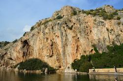 À 28 km d'Athènes, à l'abri du vent et des tumultes de la ville, un lac d'eau pure entouré de falaises oranger offrent une quiétude unique. C'est sur la route de Sounion, face à la mer du golfe Saronique, que le lac de Vouliagmeni prend sa source. Il s'agit de sources chaudes, qui perdurent depuis des millénaires. Comprise entre 21°c et 27°c suivant la saison ? 24°c dimanche dernier ? ce lac a des propriétés naturelles très bienfaisantes pour le corps et un environnement naturel qui apaise l'esprit.