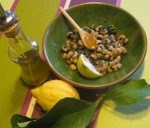 Les haricots cornille, dits aussi « haricots à l'?il noir », fassolia mavromatika en grec, sont très appréciés dans tout le pays. Ils sont habituellement servis en salade, arrosés de citron et d'huile d'olive, mais on les trouve souvent mélangés avec des épinards, des blettes ou d'autres herbes cuites. En Grèce, les blettes sont généralement cueillies jeunes, sans côtes et on peut les utiliser telles quelles. En France, ce plat offre une préparation délicieuse et saine des feuilles, après l'utilisation des côtes des blettes pour le traditionnel gratin.