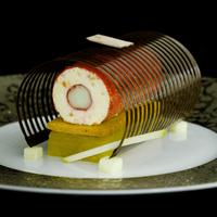 Photos : Compression de pomme, sabayon glacé a l'amande et au cassis (ci-contre) et Pêche Melba, infusion de fleurs et de fruits (ci-dessous)