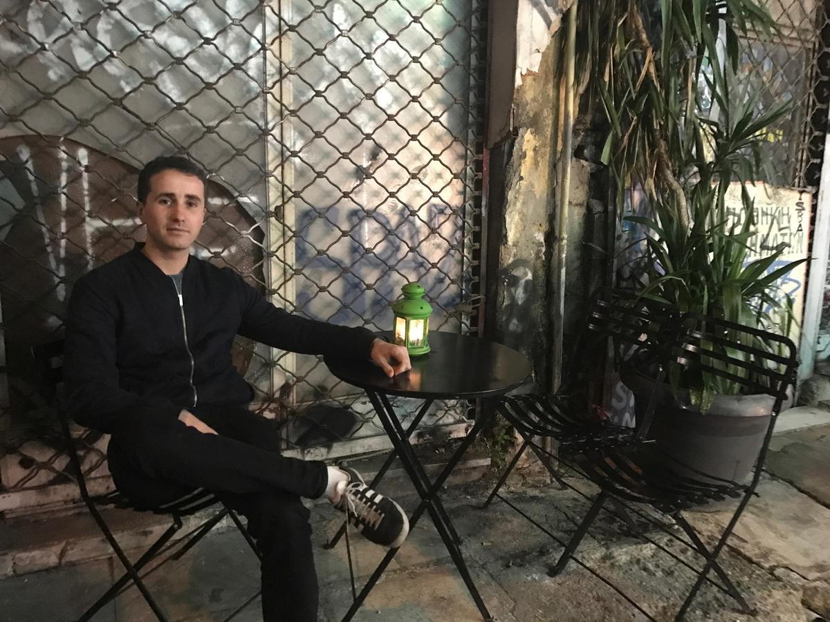 Je vis ici depuis 8 ans. Avant, je vivais à Paris. J'étais déjà vidéaste et monteur. Mais je voulais voyager, découvrir autre chose. Un ami m'a annoncé qu'il partait à Athènes. L'idée m'a plu ! Je suis parti avec lui. Je n'avais aucun projet en tête, juste un besoin d'aventure. J'ai découvert la Grèce et elle m'a beaucoup plu. Ce qui devait être un séjour de quelques mois s'est transformé en installation. Tant que je m'y sens bien, je reste ! Côté études, j'ai fait hypokhâgne et deux ans d'histoire à la Sorbonne. Pour finir, j'ai suivi une formation de monteur vidéo. J'ai adoré ! Je me suis lancé dans ce métier. Je suis vidéaste free lance. La vie de bohème !