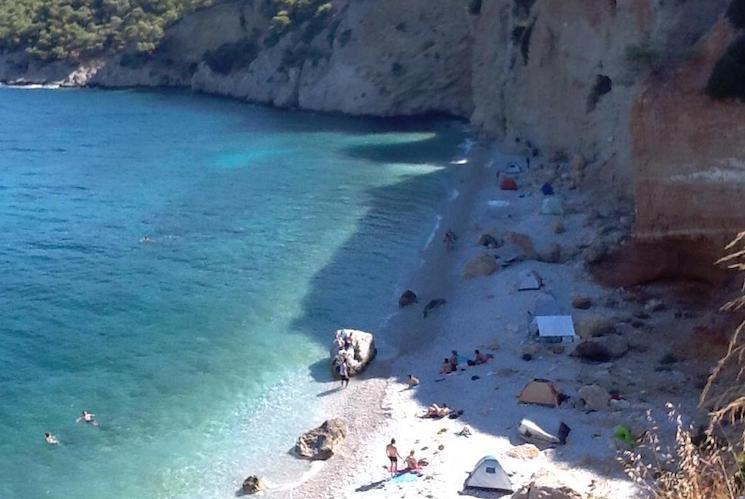 Vous vous rendrez ensuite sur le port et commencerez à marcher sur le chemin côtier. Vous passerez devant des villas inhabitées et des hôtels en sommeil. À flanc de montagne, ce chemin vous offrira une vue des plus grandioses sur les fonds marins, l’île d’Égine au loin et les autres monts insulaires qui peuplent la mer Égée. Au bout d’une bonne demie heure, vous croirez arriver dans un cul-de-sac menant sur le seuil d’une falaise. En contre-bas, en vous penchant prudemment vous apercevrez avec des yeux écarquillés une plage de galets blancs, une eau turquoise et des falaises couleur or : la plage Chalikiada. Il faudra être un peu sportif pour y descendre mais le jeu en vaut la chandelle. Une fois les pieds nus sur les galets — pas forcément très confortables — vous serez surement tentés de vous baigner, l’eau n’étant pas plus froide que celle de la Bretagne en été (mais on adore aussi la Bretagne !). Pour les moins téméraires, le bain de soleil vous comblera de tous ses rayons. Étant situé à l’est de l’île, l’ombre arrivera sur les coups de 16 heures. Ce sera donc le moment de remonter. À préciser que le nudisme y est pratiqué.