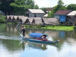 Ensuite, lorsque vous apercevrez une multitude de petites cabanes en bambous sur pilotis dispersées le long du fleuve, vous saurez que vous êtes arrivés à destination. Des paysages superbes, des gens souriants, peu de circulation?un petit goût de paradis ! Sur place, pour quelques riels, vous pourrez louer l'une de ces fameuses cabanes au bord de la rivière, vous y détendre et bien sûr y partager un pique- nique au bord de l'eau. Les propriétaires vous proposerons divers mets traditionnels du Cambodge : riz et légumes sautés, poulet grillé, poissons, écrevisses, gambas?un véritable festin ! Ensuite, vous pourrez vous laisser gagner par l'ambiance nonchalante qui règne sur Kien Svay en imitant les locaux qui piquent un petit somme dans l' un des nombreux hamacs tendus sous les cabanes. Kien Svay est un lieu assez fréquenté des cambodgiens le week-end mais, pratiquement désert en semaine, il offre un calme à la fois surprenant et agréable, à seulement quelques encablures de Phnom Penh?