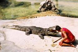 60,000 crocodiles de 28 espèces différentes qui se prélassent au soleil, la gueule grande ouverte pour se rafraîchir. Spectacle hors du commun que propose la Samutprakarn Crocodile Farm &Zoo au sud de Bangkok. La ferme se présente d'ailleurs comme le plus grand élevage de crocodiles au monde. Il est vrai que le nombre de sauriens dans ces bassins aux eaux saumâtres est très impressionnant. On frissonne à l'idée de tomber nez à nez avec ces monstres de plus de six mètres de long pour une tonne. La ferme aux crocodiles a du reste longtemps figurée dans le Guiness book des records, détenant le plus gros spécimen en captivité : 6m19 et 1115 kg ! Ces mastodontes placides en apparence se déchaînent quand les visiteurs leur distribuent des morceaux de viande que le parc propose d'acheter. Tous les jours, six spectacles sont présentés. Avec humour et culot, de drôles d'acteurs jouent un bras ou une tête à chaque représentation avec des géants qui d'un coup de gueule pourraient les réduire en miette.