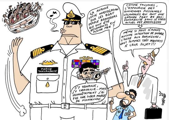 Le cartooniste Stephff nous fait partager son regard sur l'actualité thaïlandaise marquée ces jours-ci par l'affaire des migrants clandestins Rohingya renvoyés en pleine mer par l'armée thaïlandaise