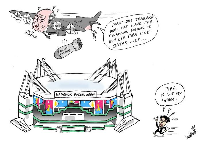 Le cartooniste Stephff nous fait partager son regard sur l'actualité thaïlandaise marquée par le refus la semaine dernière de la Fédération internationale de football association (FIFA) d'utiliser le Bangkok Futsal Arena pour recevoir les matchs de la coupe du monde de Futsal (football en salle). La FIFA avait considéré que le nouveau stade spécialement construit par la municipalité de Bangkok (BMA) pour un coût de 1,2 milliard de bahts ne satisfaisait pas aux critères requis, notamment en termes de sécurité. Le vice-gouverneur de Bangkok, Taya Teep-suwan, avait indiqué qu'à terme le Bangkok Futsal Arena serait destiné à la jeunesse et à l'organisation de compétitions nationales.