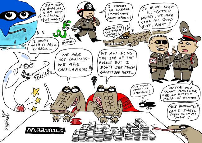 Le cartooniste Stephff nous fait partager son regard sur l'actualité thaïlandaise marquée par l'affaire qui concerne un officiel du gouvernement, Supoj Saplom. Le secrétaire permanent du ministère du Transport, a été victime du cambriolage de sa maison le 12 novembre par un groupe de malfaiteurs qui aurait dérobé 26 millions de bahts, selon les indications données hier par le chef de la police de Bangkok. Si seulement 16 millions ont pour l'instant été retrouvés par les forces de l'ordre, les voleurs avaient indiqué qu'ils avaient dérobé plus de 200 millions de bahts en espèces, et qu'ils auraient trouvé dans la maison de l'officiel entre 700 millions de bahts et un milliard de bahts en argent liquide cachés dans des sacs. La Commission nationale anti-corruption (NACC) a décidé hier d'enquêter sur cette affaire ainsi que de geler l'argent volé chez Supoj. Ce dernier a été transféré la semaine passée à un poste inactif du Bureau du Premier ministre.