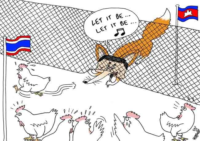 Le cartooniste Stephff nous fait partager son regard sur l'actualité marquée par les voyages de Thaksin au Laos et Cambodge durant la semaine de vacances de Songkran. L'ex-Premier ministre, aujourd'hui vivant en exil, a indiqué à des milliers de partisans venus l'écouter dans chacun de ces pays qu'il serait de retour en Thaïlande cette année. Samedi, Thaksin a entonné lors d'un rassemblement à Siam Reap au Cambodge la chanson Let it Be de Jonh Lennon, dans le but de provoquer ses ennemis, selon l'éditorialiste du quotidien anglophone The Nation, Tulsathit Taptim.