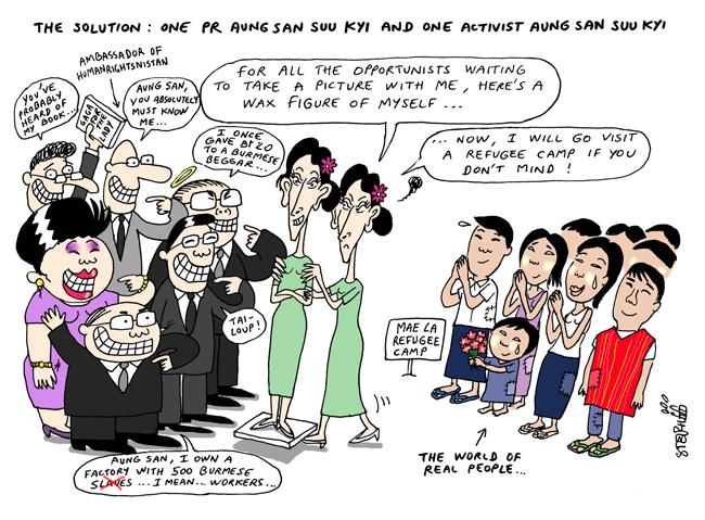 Le cartooniste Stephff nous fait partager son regard sur l'actualité thaïlandaise marquée par la visite actuelle d'Aung San Suu Kyi dans le royaume, son premier voyage à l'étranger depuis 24 ans. L'icône de la démocratie birmane a rencontré hier le vice-Premier ministre thaïlandais chargé de la police, Chalerm Yubamrung, pour s'entretenir au sujet des travailleurs immigrés birmans et de la coopération entre les deux pays dans la lutte contre la drogue. Selon le Bangkok Post, elle a fait part de ses préoccupations au sujet des complications du processus de vérification de la nationalité des travailleurs immigrés en Thaïlande, qui aurait triplé le coût réel du travail dans le royaume. Mercredi, Suu Kyi avait promis de l'aide à des immigrés birmans de la province de Samut Sakhon qui souhaitent rentrer au pays. Elle s'exprimera aujourd'hui au Forum économique mondial pour l'Asie de l'Est auquel participent de nombreuses personnalités, dont des chefs d'Etat de la région. La chef de l'opposition birmane souhaite également se rendre cette semaine dans la province de Tak pour rendre visite à des réfugiés birmans. Une dizaine de camps, dont celui de Mae La, situés dans le nord de la Thaïlande abritent depuis des années quelque 100.000 Birmans, chassés de leur pays par les combats entre l'armée et des rebelles de minorités ethniques.