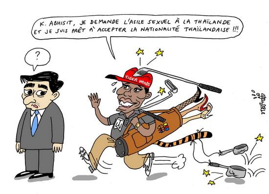 Le cartooniste Stephff nous fait partager son regard sur l'actualité marquée ces jours-ci par les déboires matrimoniaux du champion de golf américano-thaïlandais, Tiger Woods, associé à une dizaine de maîtresses. En 2000, le gouvernement thaïlandais lui avait proposé la nationalité thaïlandaise, mais Tiger Woods avait alors décliné l'offre