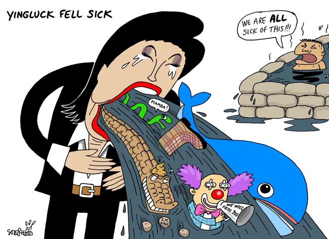 Le cartooniste Stephff nous fait partager son regard sur l'actualité thaïlandaise marquée la semaine passée par les problèmes de santé de la Premier ministre Yingluck Shinawatra. Le chef du gouvernement avait dû être hospitalisé mardi dernier pour une intoxication alimentaire. Puis à son retour d'un voyage officiel au Vietnam, Yingluck a dû annuler ses rendez-vous du jeudi après-midi, en raison de nausées et de maux de tête. La Premier ministre est apparue éreintée physiquement et épuisée nerveusement à de nombreuses reprises lors de la crise des inondations qui touchent la Thaïlande depuis fin juillet.