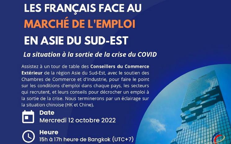 Les Conseillers du Commerce Extérieur de la France basés en Asie du Sud-Est feront le mercredi 12 octobre un tour de table sur la situation du marché de l’emploi dans la région au sortir de la crise du Covid. Ils feront le point sur les conditions de l’emploi dans chaque pays, les secteurs qui recrutent, et donneront des conseils pour décrocher un emploi à la sortie de la crise.