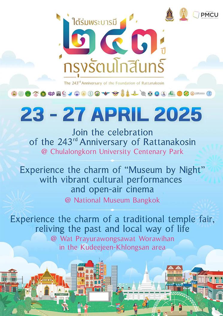 Ces célébrations intitulées « 243 années sous la grâce royale de Rattanakosin », se dérouleront au parc du centenaire de l’Université Chulalongkorn, au Musée national de Bangkok et au temple Wat Prayurawongsawat. Durant cinq jours, les visiteurs pourront découvrir des expositions et assister à des spectacles, cérémonies religieuses et autres activités culturelles.