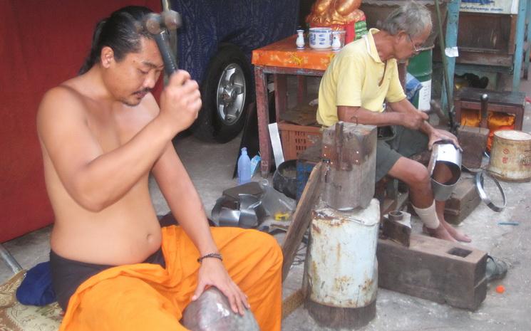 Mais certains de ces bols sont encore réalisés en acier et à la main, comme le veut la tradition, dans les petites ruelles de Baan Bat, le "village des bols". Il s’agit du dernier des trois villages établis à Bangkok par le roi Rama Ier pour la fabrication de bols à aumônes. Les deux autres ont disparu, mais la tradition ancestrale dans les pays bouddhistes de la fabrication à la main de ces objets en acier perdure encore à Bangkok. Il ne reste plus que 5 familles aujourd’hui, soit un total de 35 personnes, qui vivent directement de la fabrication et de la vente de ces bols. Il y en avait encore une dizaine il y a 20 ans. "C’est une activité qui nécessite de la passion, car il s’agit d’un métier dur et répétitif. Cela peut faire peur à certains et décourager les vocations", reconnait Vetpisei Virun, un des artisans de Baan Bat, âgé d’un cinquantaine d’années, qui donne volontiers quelques explications au touriste de passage.