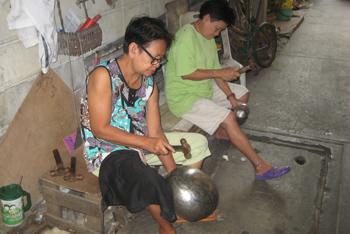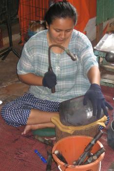 La technique traditionnelle utilisée n’a guère varié depuis plus de deux cents ans, date de l’installation de ces familles d’artisans originaires d’Ayuthaya ou du Cambodge. Tout au plus, les outils sont-ils plus résistants et perfectionnés et les plaques d’acier de meilleure qualité. Nirawit Sisaï, un solide trentenaire qui passe une bonne partie de sa journée torse nu à travailler sur un siège aménagé pour la fabrication des bols, fait preuve de pédagogie pour décrire un travail qui se fait étape par étape: découpage de la plaque, réalisation de crans sur les rebords, pliage de la plaque, assemblage des différentes parties découpées, soudure au cuivre, arrondissage des angles avec un marteau, cuisson au feu de bois, polissage des bols, laquage etc. Au total, près d’une vingtaine de gestes différents est nécessaire. "C’est un travail où il faut faire preuve de patience. Chaque étape doit être faite avec soin. La partie la plus longue est sans doute l’arrondissage du bol avec un maillet. Il faut un total de trois ou quatre jours de travail pour un bol standard, une journée pour un petit", indique-t-il.