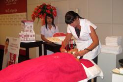 Sandrine Carliez, chargée de formation et du développement international, fait la démonstration d'un soin du visage avec deux électrodes (photo Yann Fernandez)