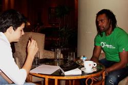 Pierre Besson, élève du Lycée Français International de Bangkok en stage d'une semaine au petitjournal.com, interviewait vendredi Christian Karembeu de passage à Bangkok (Photo LPJ)