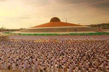 En toile de fond: la gigantesque enceinte du temple qui abrite 3.000 moines sur un terrain de 400 hectares qui compte de multiples bâtiments et un stupa principal en forme de soucoupe volante et orné de 300.000 statues de bouddha.