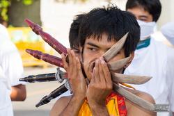 Mais certains adeptes ne peuvent s'empêcher de crier, au moment où la lame transperce leur chair. Certains vont jusqu'à arborer lors des parades religieuses dans les rues de la ville de Phuket les objets les plus étonnants: l'un d'eux exhibe une tour Eiffel, du type de celles vendues aux touristes à Paris, enfoncée à mi-hauteur à travers sa langue. Un autre s'est passé un manche de pelle dans les deux joues... La pelle elle-même étant revissée dans un second temps.