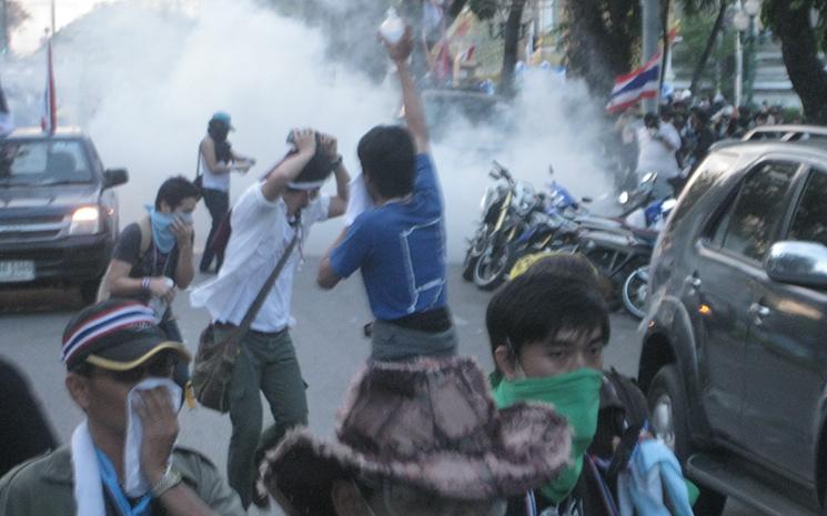 En 2010, alors que les rôles entre anti et pro-gouvernement étaient inversés, l'armée, alors dirigée par le même Prayuth, avait tiré des balles en caoutchouc sur des groupes qui tentaient de freiner l'avancée des militaires et lâché depuis des hélicoptères des gaz lacrymogènes sur la foule de manifestants rassemblés autour du Monument de la démocratie ? parmi les manifestants qui campaient là depuis près d'un mois, se trouvaient des femmes, des enfants et des personnes âgées. Cette première tentative de dispersion des manifestants s'était soldée par des affrontements qui avaient fait 25 morts et des dizaines de blessés dans les deux camps.