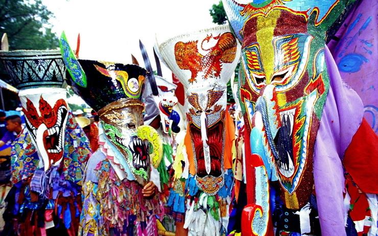 Les costumes, réalisés à la main, sont composés de bandes de tissus bigarrées. Quant aux masques, ils sont faits d'écorces de riz ou de cocotiers, et sont surmontés des pièces d'osier qu'on utilise pour cuire le riz. Les villageois portent parfois des cloches au niveau de la taille et des armes telles que des épées ou des haches aux formes phalliques. La procession est accompagnée de chants et de danses.