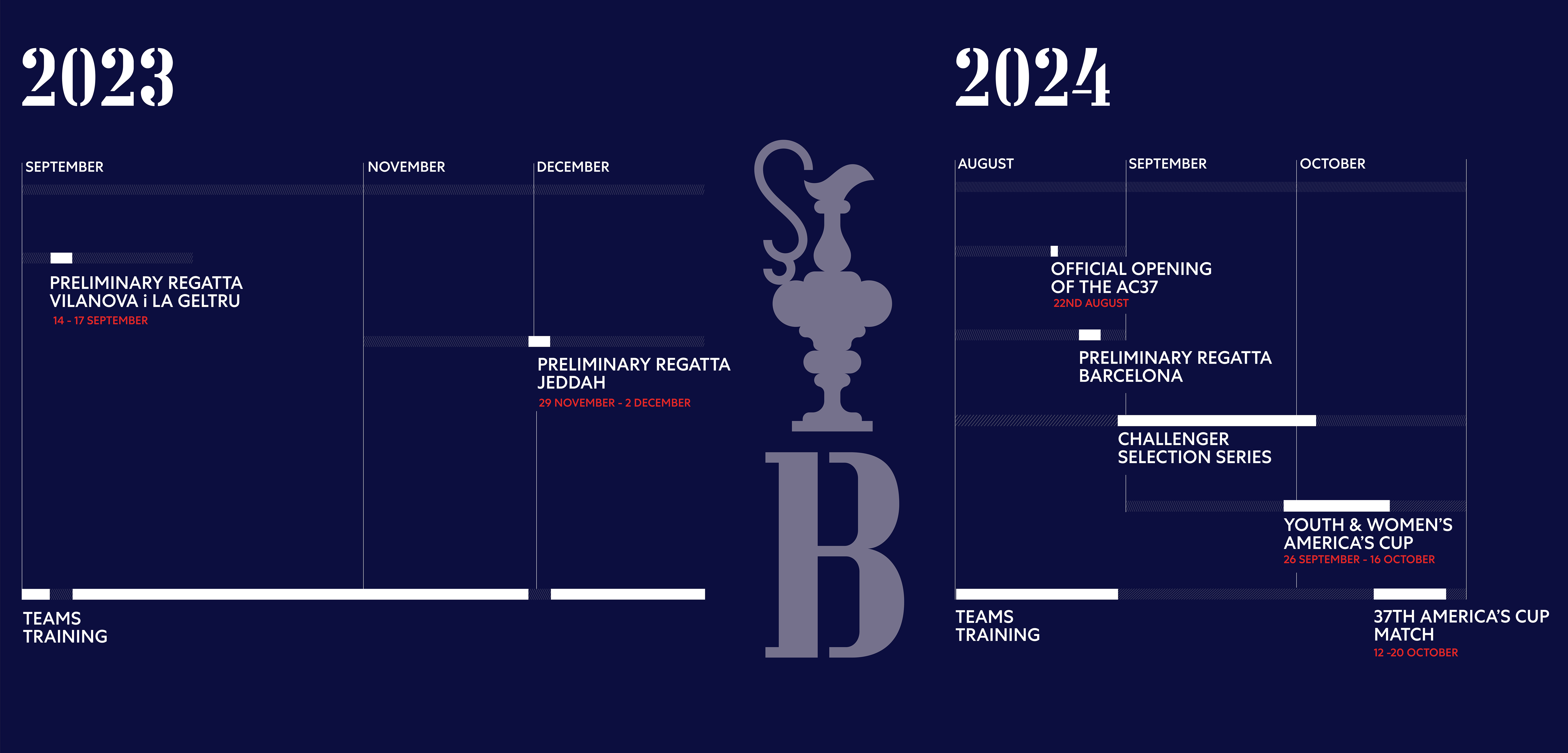 Quant aux festivités, bien qu'il y ait eu des régates préliminaires dans la ville de Vilanova i la Geltrú du 14 au 17 septembre dernier, la compétition commencera réellement le 22 août 2024, et comprendra de nombreuses épreuves s'étalant jusqu'en octobre où aura lieu le duel final. Le calendrier précis peut être consulté ici.