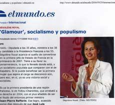 A la mi février, deux articles paraissaient successivement dans les pages internationales d'El Mundo; deux portraits de nos têtes de listes françaises: Ségolène Royal et Nicolas Sarkozy. Deux phénomènes médiatiques sur lesquels se sont penchés les rédacteurs de ce quotidien national. Pour elle, "Glamour, socialisme et populisme", pour lui, "Conservateur à la main dure". Les carrières professionnelles fulgurantes des deux candidats sont détaillées avec leur lot de succès respectifs. Et l'on retrouve ce quotidien plutôt de droite, là où on ne l'attendait pas. Le parcours de Royal apparaît sans fausse note et "météoritique", celui de Sarkozy "l'excessif et autoritaire" est en revanche jalonné de multiples "trahisons". Le "petit traître" puisque c'est ainsi que l'appelle El Mundo depuis son alliance avec Balladur, inquiète 51% des Français comme le rappelle le journal, même s'il reste en tête des sondages. Il est ce "rouleau compresseur" qui consacre son énergie à "réaliser le rêve de sa vie: être Président". Ségolène Royal, elle, "a en sa faveur son charisme, son sourire enchanteur et son élégance" qui font d'elle "la bouffée d'air frais de la politique française".