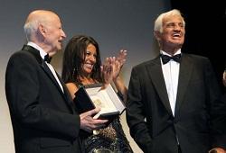 Le président du Festival de Cannes, Gilles Jacob, remet la Palme d'Or à Jean-Paul Belmondo, en compagnie de sa femme, Barbara Gandolfi. (Photo AFP)