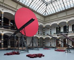 Au centre de l'exposition se dresse "Symphony for a Beloved Sun" (2013), une installation dynamique et énigmatique créée in situ par Kapoor. Quatre tapis roulants sortent du sol et des murs de l'atrium du musée pour s'élever vers un énorme disque rouge en transportant, à intervalles irréguliers, des blocs de cire qui tombent en débris sur le sol recouvert de lino. Une ?uvre en mouvement, en référence aux lithographies du constructiviste russe El Lissitzky et ode au sculpteur allemand Joseph Beuys, qui exposa dans le même atrium juste après la restauration du bâtiment en 1982.