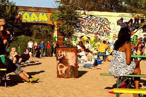 Après s'être délesté de ses bouteilles à l'entrée, le portier est très strict sur ce point, on pénètre dans un autre univers. Exit, la Stralauer Platz, le bitume et les véhicules qui défilent à toute allure. Ici, l'ambiance est à la cool, les bières passent d'une main à l'autre, on flâne sur les chaises longues ou sur la pelouse. Des effluves de Mariejeanne flottent dans l'air. Pour peu que les lieux soient un minimum ensoleillés, on se croirait presque sous les tropiques.
