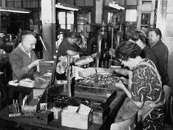 Fabrication de brosses en graphite dans les ateliers francfortois après-guerre (© Mersen)