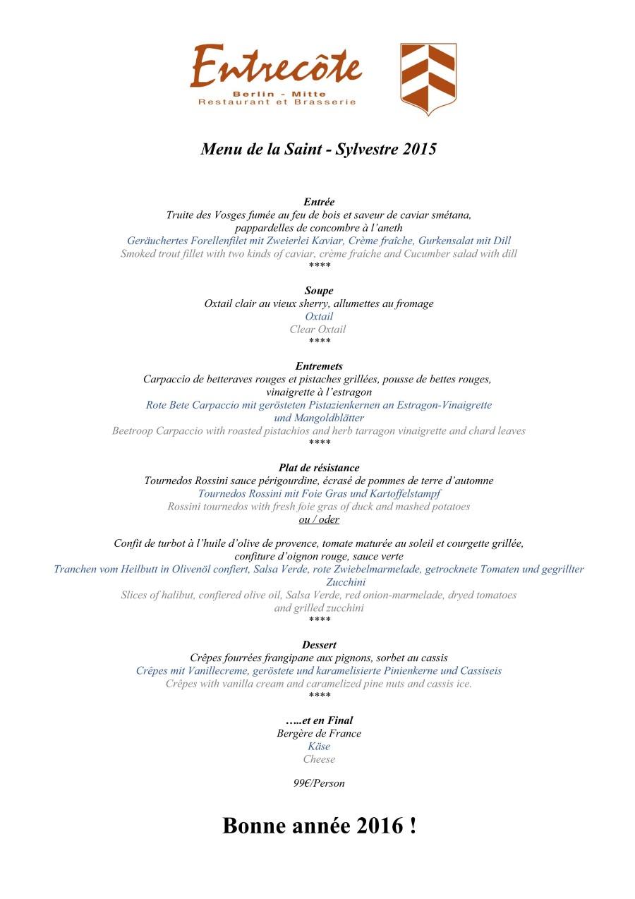La soirée du nouvel an n'est jamais un soir comme les autres et quoi de mieux pour célébrer la Saint-Sylvestre qu'un délicieux repas. Le restaurant berlinois, l'Entrecôte, a confectionné un menu aux petits oignons pour ravir les palais des gastronomes que ce soit en amoureux ou entre amis. Réservez dès à présent votre table en vous rendant sur le site de l'Entrecôte.
