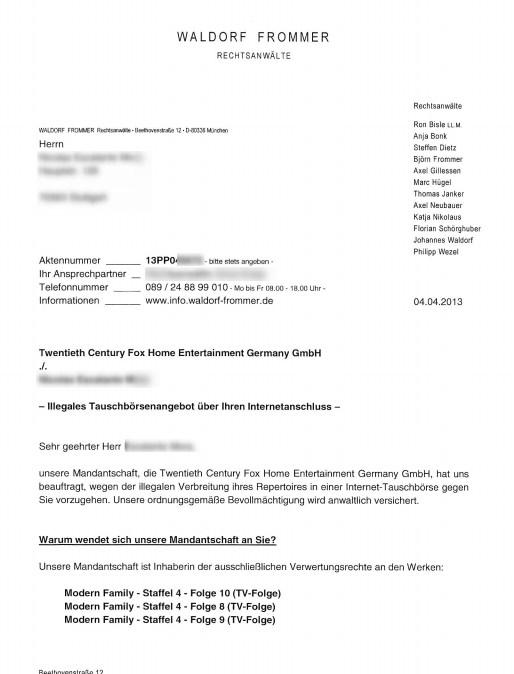 Contrairement à la France, où il existe une autorité supérieure se chargeant de faire respecter la loi, en Allemagne ce sont les cabinets d'avocat eux-mêmes qui poursuivent les internautes peu attentifs aux lois en vigueur concernant le téléchargement illégal. Ainsi, la protection des droits d'auteur rapporte énormément à certains cabinets qui en ont fait un véritable business. Le cabinet le plus connu étant le cabinet Waldorf-Frommer basé à Munich. Mais, plus que ces pratiques très lucratives, il existe également des arnaques. Des personnes peu scrupuleuses se faisant passer pour des avocats envoient ainsi des lettres similaires incitant à régler une somme relativement élevée. Par peur et par manque d'information, beaucoup préfèrent payer le montant demandé.