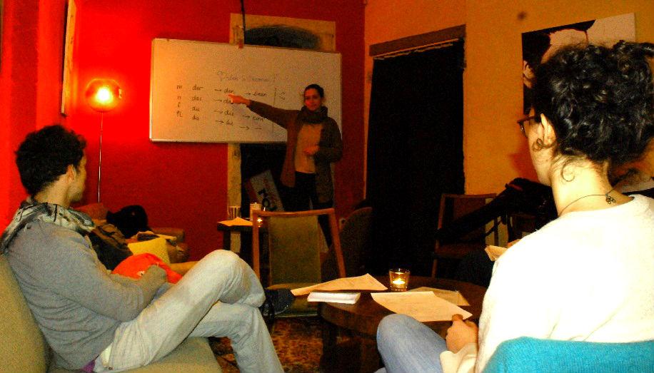 Toutes les semaines du mardi au mercredi soir, Lisa, Peter, Diviam et Audrey donnent de leur temps libre pour enseigner la langue de Goethe aux étrangers fraîchement débarqués dans la capitale allemande mais aussi aux plus anciens. C'est dans une petite salle au fond du café Zapotek, situé à Neukölln, que les quatre jeunes étudiants proposent des cours de grammaire et de conversation pour différents niveaux. Ouverts à tous et sans obligation d'inscription, il fonctionne sur le principe du "Pay what you want". Libre aux participants de verser la somme de leur choix dans une boîte à "pourboire" à la fin de l'enseignement. "Nous avons voulu proposer autre chose que les écoles de langue qui reviennent chères et dont les horaires ne sont pas adaptés aux personnes qui travaillent", explique Lisa, qui se destine à être professeur d'Allemand. "De plus, chez nous les cours sont faits maisons", ajoute-t-elle. Les quatre enseignants ne se réfèrent à aucun livre pour préparer leurs cours et ne suivent aucun plan prédéfini. Aux exercices "bêtes et méchants", Lisa et ses collègues préfèrent aborder des thèmes de la vie de tous les jours et travailler en fonction des besoins de leurs élèves. "Il faut être allé vivre au moins une fois à l'étranger pour comprendre ce que l'on ressent quand on arrive dans un pays sans connaître un seul mot de la langue", explique la fondatrice du projet, qui s'est inspirée de son expérience d'expatriée d'un an en Espagne pour mettre en place ces cours d'allemand alternatifs.