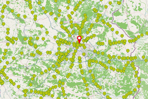 Il suffit de placer son curseur sur un arrêt, reconnaissable par un cercle jaune entourant la lettre H, comme « Haltestelle ». Berlin disposant de plus de 13 000 arrêts tous moyens de transports confondus, la carte interactive regorge de ces petits cercles.