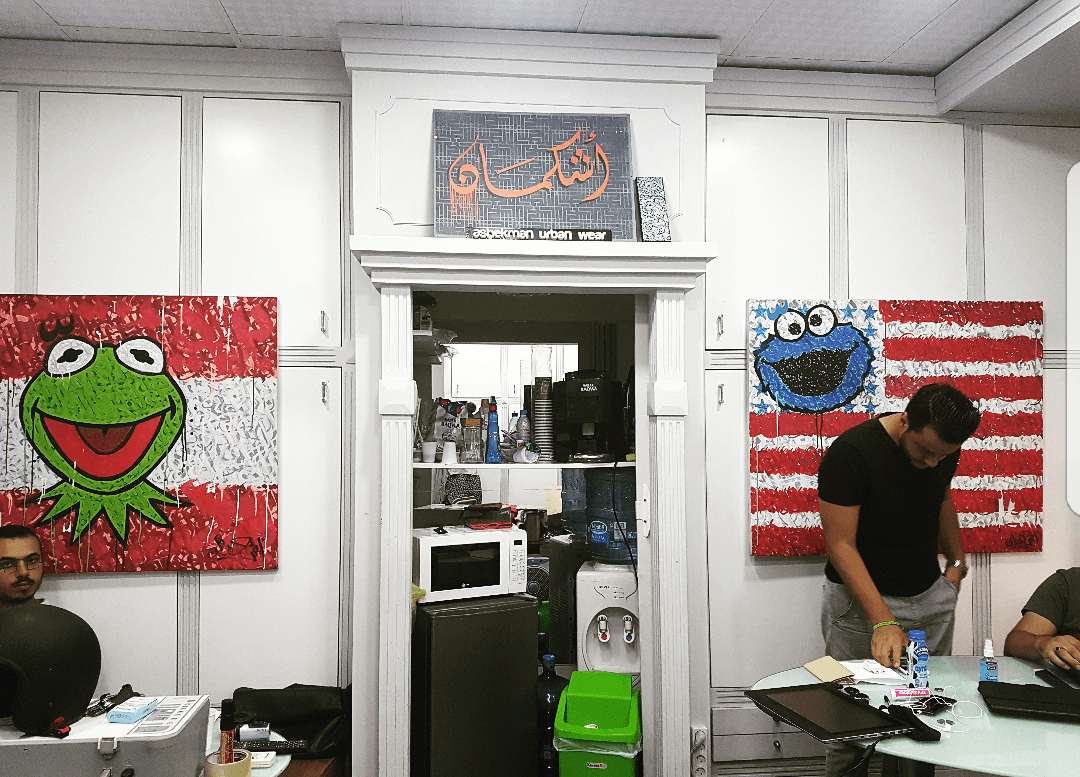 Dans leur atelier, situé dans le quartier de Hamra, leurs oeuvres colorées et bombes de peinture sont accrochées aux murs.