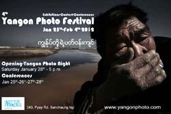 L'Institut Français de Birmanie accueillera du 25 janvier au 4 février la quatrième édition du Yangon Photo Festival. Placée sous le signe de l'environnement, cet événement met en lumière les travaux d'artistes internationaux confirmés et de jeunes talents locaux. L'icône de la démocratie birmane, Aung San Suu Kyi, sera la marraine et la présidente du jury du festival