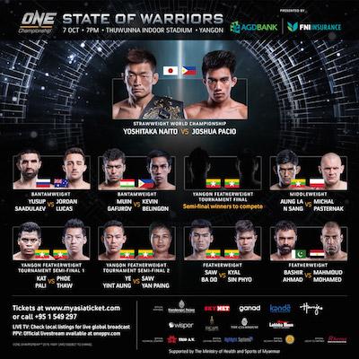 Amateurs de MMA, ne manquez pas ce soir le tournoi ?STATE OF WARRIORS? organisé par ONE FC dès 19h au Thuwunna Indoor Stadium de Yangon!